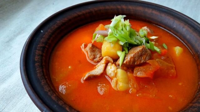 Как известно предпочтения у всех разные. Это касается и мяса. Этот рецепт как раз для тех, кто по каким-то причинам недолюбливают говядину, но любят свинину. Венгерский гуляш, приготовленный таким способом, тоже получается очень вкусным. 🔥 Лучшее в телеграм: Посмотреть Ингредиенты: Способ приготовления: Свинину нарезаем кубиками 2х2 см. Морковь режем небольшими кусочками, лук — полукольцами. Перец, предварительно удалив все безвкусные части, режем крупно. Помидоры лучше бланшировать, чтобы жесткая шкурка не портила восприятие блюда. Для этого нужно сделать крестообразный надрез на кожице. Ненадолго опустить овощи в кипяток, а затем в холодную воду. Таким образом шкурка легко отделится от мякоти. Очищенный овощ разрезаем на 4 части. Картофель режем крупно. Т.к ингредиентов достаточно много, рекомендую взять кастрюлю побольше, (примерно на 6 литров), лучше если она будет иметь толстые стенки и дно. Наливаем на дно посуды растительное масло и обжариваем свинину. Не солите мясо сразу, ина