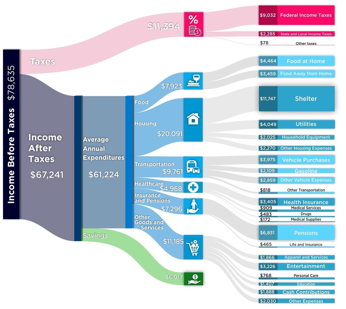 Американцы в среднем тратят 12,5% своего ежемесячного дохода на транспорт ~ 812$. Это могут быть платежи по кредиту за автомобиль, страховка автомобиля, бензин и обслуживание. Все вот это усреднено в один показатель.