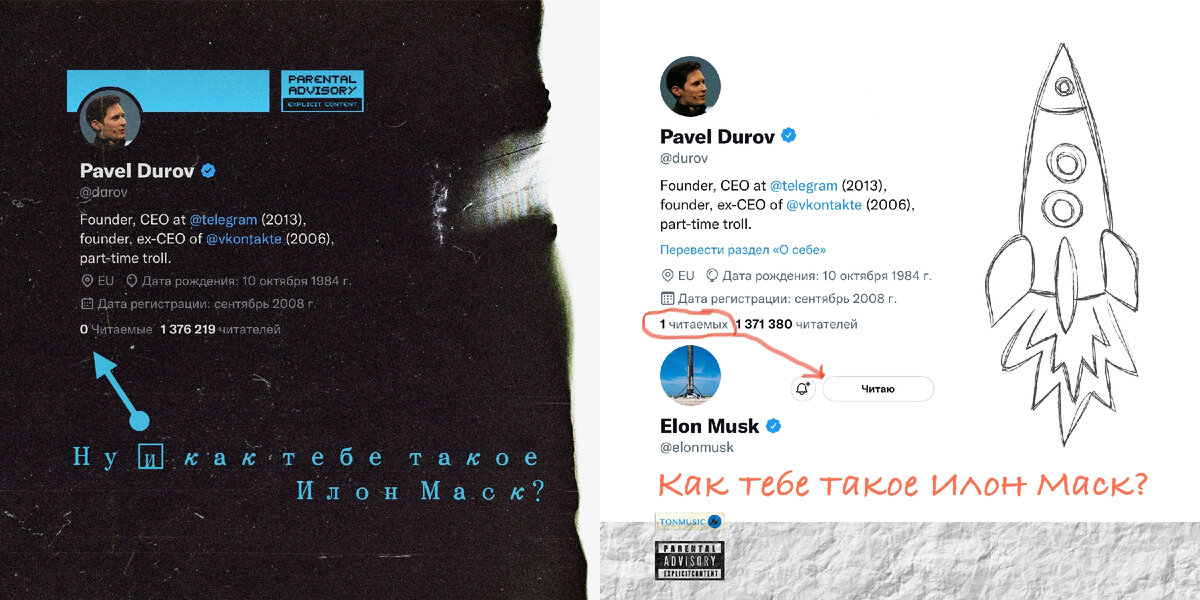 Когда и по какой причине это произошло, я не знаю, но знаю точно, что в моей NFT коллекции Durov’s Album Covers, давно уже на продаже обложка, с названием «Как тебе такое Илон Маск?». На ней изображен скрин из твиттера Павла, где у него в читаемых всего 1 человек и это Илон. Недавно я заглянул в твиттер к Дурову и был удивлен, теперь Павел вообще ни кого не читает. Самое интересное, что в инфополе была тишина и даже Код Дурова ни чего не написал об этом (ну или я пропустил). Вся эта история побудила меня на создание ещё одного несуществующего музыкального альбома Павла Дурова и обложка с названием «Ну и как тебе такое Илон Маск?» уже в продаже на Getgems в коллекции Durov’s Album Covers #nft #nfts #toncoin #ton #ПавелДуров #ИлонМаск