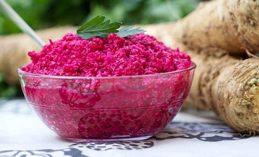 Осенью и зимой часто готовлю блюда из свёклы: салаты, гарниры, соусы и приправы, которые и "душу согреют, и кровь разгонят". И добавленный хрен — самый подходящий для этих целей корнеплод. Додумался же какой-то добрый человек соединить вместе хрен и свёклу нам на радость. И красота, и вкуснота. А то свёклу всё с чесноком чаще готовят, да с орехами. А тут свекольная икра, да с хреном! Вкусно, просто и необычно. Количество регулирую по едокам. Осенью готовлю с корнем хрена, который в огороде растёт. Зимой чаще всего с готовым хреном из баночки готовлю, потому что корень стоит как чугунный мост. Ингредиенты: 3 варёных (запечёных) свёклы среднего размера (около 0,5 кг) 50 гр. очищенного корня хрена или 1/3 или больше по вкусу от 200 гр. баночки готового хрена 2 ч. л. 6% уксуса соль, сахар — по вкусу Я выбираю среднюю по величине свёклу, мою, отвариваю на небольшом огне. Охлаждаю под холодной водой, чищу и натираю на мелкой тёрке. А очищенный хрен пропускаю через мясорубку. Можно и на тёр