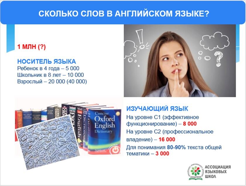 Этим вопросом задается каждый, кто изучает иностранный язык. Прежде чем на него ответить, давайте представим себе, сколько и какие слова нужно выучить для свободного общения на иностранном языке. Рассмотрим языковую пару: английский-русский. По исследованиям российских ученых, в русском языке насчитывается до 500 тысяч лексических единиц. Выпускники российских школ и колледжей имеют в своем пассивном словаре до 75 тысяч слов, выпускники университетов – 80 тысяч, а кандидаты и доктора наук – около 85 тысяч. Британские специалисты полагают, что в английском языке используется до 1 миллиона лексических единиц. В это количество включены слова из всех вариантов английского языка, используемых в мире. Известно, что ребенок в возрасте 4 лет использует в своей речи до 5 тысяч слов, школьник 8 лет – до 10 тысяч, а взрослый – в пределах от 20 до 40 тысяч слов. Изучающий английский язык в качестве иностранного и владеющий им на уровне С1 (Эффективное владение) по Европейской шкале языковых компет