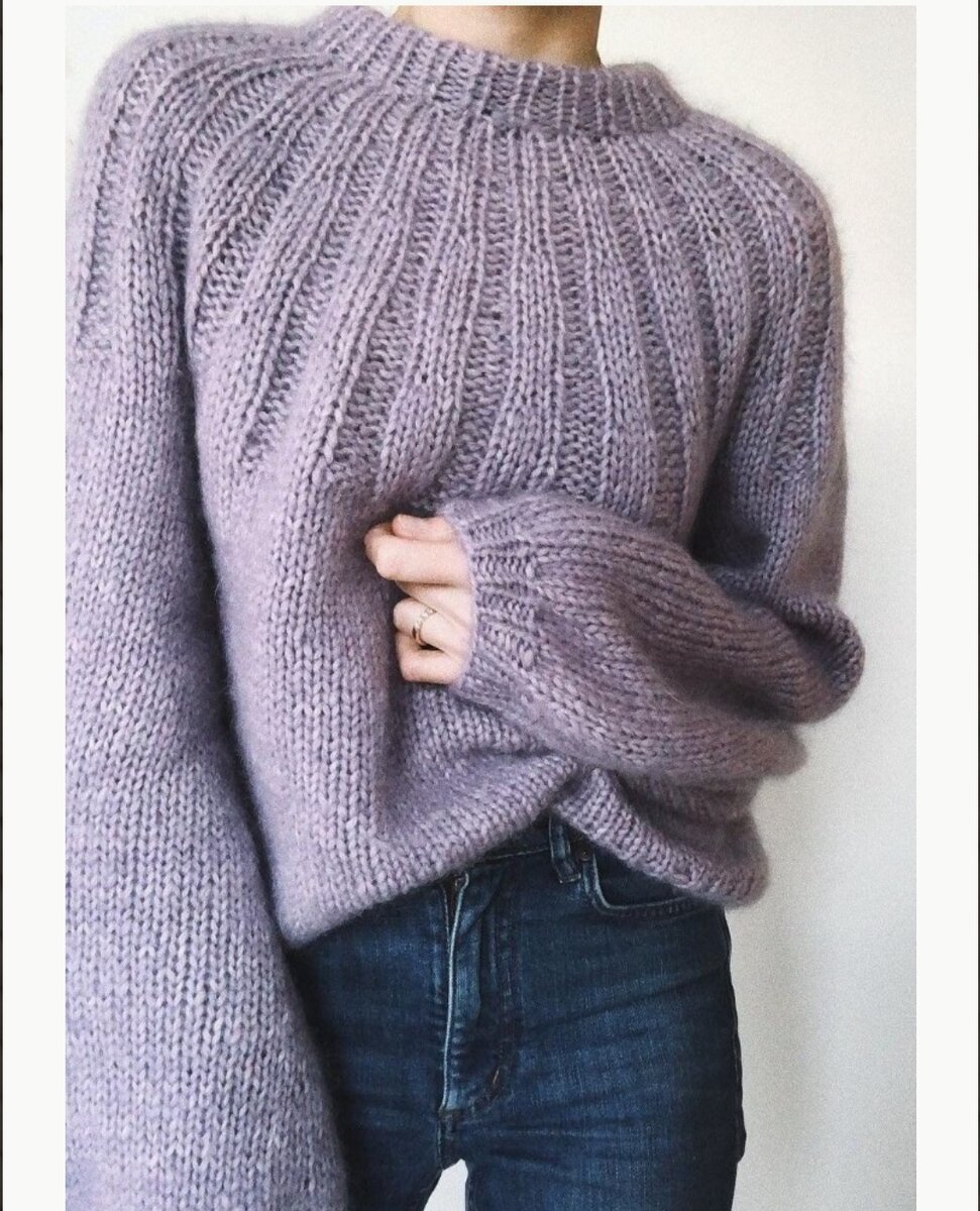 Стильный свитер от норвежского дизайнера PetiteKnit вяжется спицами по кругу с формированием в узоре резинки на кокетке, начав сверху от горловины и двигаясь вниз. Особый шарм подобным трендовым моделям добавляет ниточка тонкого мохера, которая разбавляет полотно невесомым пухом молодых козочек, тем самым создавая ауру воздушности и невесомости даже при объемах оверсайза и пышных рукавах. Описание вязания свитера: Описание составлено для размеров XS (S) M (L) XL (XXL). Свитер имеет положительный припуск 5-10 см к обхвату груди. Размеры XS (S) M (L) XL (XXL) соответствуют обхвату груди приблизительно 85 (90) 95 (100) 110 (120) см. Финальные измерения свитера уже включают эти 5-10 см припуска. Размеры готового свитера следующие: Окружность груди: 91 (97) 100 (109) 120 (129) см. Длина: 52 (54) 56 (58) 62 (64) см. Измерьте свой обхват груди, чтобы выбрать лучший для вас размер и начать набирать петли. Например, если ваш обхват груди 90 см, то лучше вязать по размеру S, припуск при э