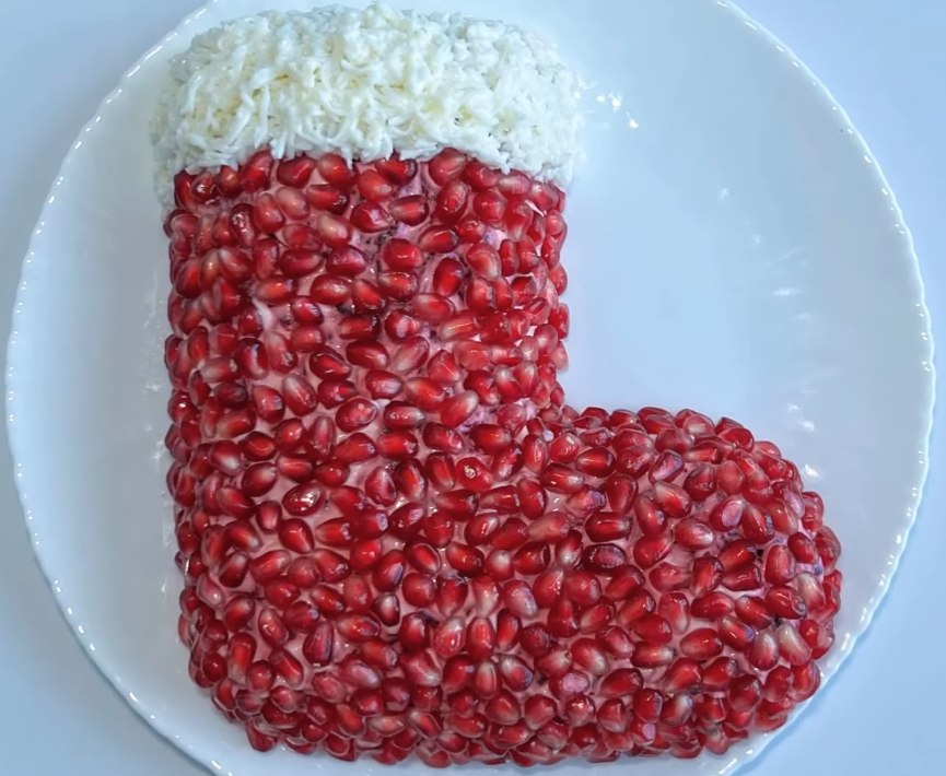 1. Салат Новогодний Сапожок Ингредиенты: - 250 г. копченой курицы; - 2 шт. вареного картофеля; - 2 небольшие вареные морковки; - 1 вареная свекла; - 60 г. грецких орехов; - 1 гранат; - яичные белки от 2-х вареных вкрутую яиц; - соль по вкусу; - майонез. Приготовление: Для начала на блюде, на котором планируем подавать салат нарисуем форму сапожка. Первым слоем выкладываем подсоленный отварной картофель, тертый на крупной терке и покрываем его майонезом. Следующим слоем выкладываем копченую курицу и тоже покрываем ее майонезом. Далее- морковка, тертая на крупной терке и так же покрытая майонезом. Теперь- дробленые грецкие орехи. А за ними свекла на крупной терке, смазанная майонезом. Следующим шагом, выкладываем зерна граната, очерчивая форму сапожка, а в верхней ео части тертыми белками варенных яиц оформляем "мех" и получаем готовое блюдо. Приятного аппетита! 2. Салат из Курицы с Ананасами Ингредиенты: - 2 шт. куриного филе; - 150 г. сыра; - 1 б. консервированных анан