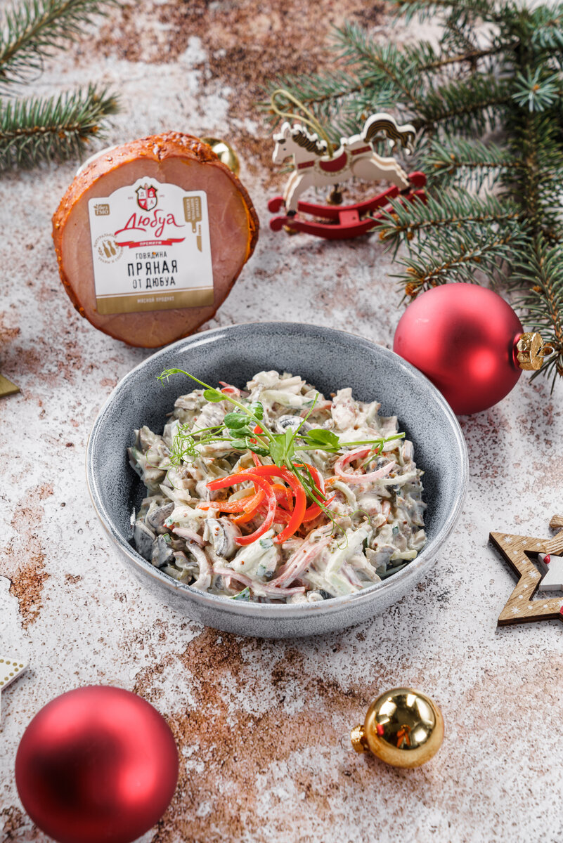 Мы советуем приглашать гостей и ходить в гости самим. А если гости вот-вот окажутся на пороге, на помощь приходит говядина "Пряная" от Дюбуа. Именно с ней мы советуем приготовить вкусный и очень быстрый салат Салат "Пряный" Ингредиенты: Говядина "Пряная" от Дюбуа - 400 г Болгарский красный перец - 2 шт Яйцо куриное (вареное) — 3 шт Редька (белая (маргеланская, белый клык, дайкон)) — 100 г Морковь (средняя) — 1 шт Огурец — 1 шт Капуста белокочанная / Капустa — 100 г Майонез - по вкусу Лук красный - 2 шт Веточка зелени - для украшения Соль, сахар Уксус Способ приготовления: 1. Говядину, лук и перец нарезать соломкой 2. Морковь и редьку моем, чистим, нарезаем (натираем) тонкой соломкой. Заливаем морковь и редьку подсоленной водой с уксусом и отставляем на 15 минут. 3. Капусту нарезаем тонкими полосками, огурец соломкой. Капусту слегка перетираем с солью. 4. Морковь и редьку отжимаем. Добавляем к ним капусту, огурец и нарезанную тонкими полосками говядину "Пряную". 5. Кладём нарезанные вар