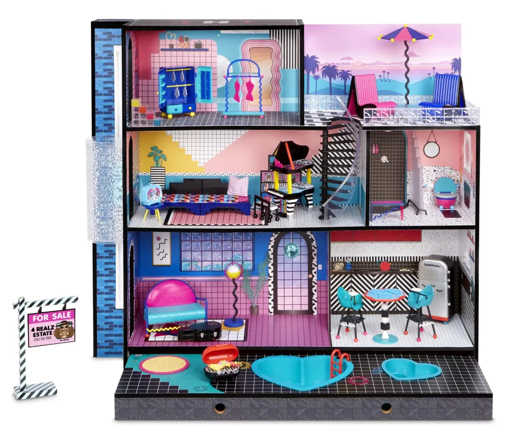 Этот кукольный домик сделан из натурального дерева и включает в себя 85+ сюрпризов. Его высота и ширина составляет 91 см, а вес 21 кг. Домик состоит из 3 этажей и 6 комнат: спальня, ванная, кухня, гостиная, балкон и гардеробная. Помимо этого, есть винтовая лестница, лифт, бассейн, внутренний дворик, джакузи и многое другое. Домик оснащен звуковыми эффектами и освещением. Задняя часть домика — наклейка с изображением торгового центра.