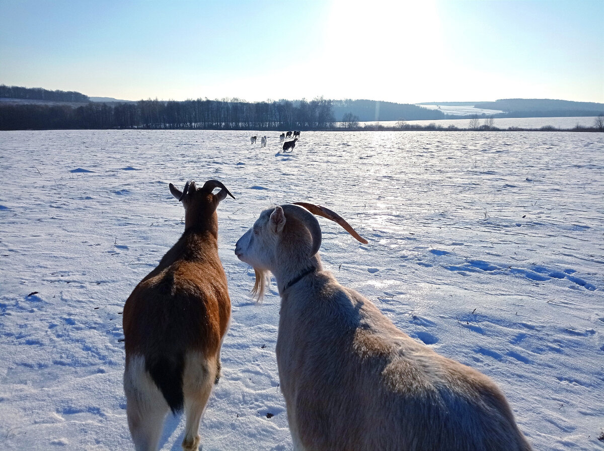 P.S. Порой я просто не могу (да и не хочу, если уж честно) не видеть аналогии в человеческом и животном поведении. Когда мы проходили первую замерзшую бобровую запруду, собаки и Сметана запросто последовали за нами по льду. Оня же с Рогаликом запаниковали, начали носиться туда-сюда и, в конце концов, остались стоять на берегу, испуганно крича вслед уходящим нам (я надеялась, что хоть это подстегнет их). В итоге мне пришлось за ними возвращаться. Я взяла Оню за ошейник и потащила этого огромного козла за собой. А он еще и сопротивлялся! Но у копыт очень плохое сцепление со льдом, так что я это дотащила до другого берега. Рогалик шел за нами сам (я вообще считаю, что это Оня панику нагонял и «заражал» ею моего любимого козла). Потом Рогалик и Оня почти без труда преодолевали подобные препятствия, которые попадались у нас на пути. Оню, правда, пришлось еще раз протащить в одном месте. У Рогалика же все сложилось, и дальше козел уже увереннее ходил по замерзшей воде.