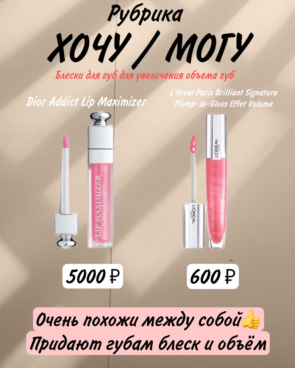 Аналог блеска от Dior 🔥 ✅ХОЧУ : Блеск-плампер для губ Dior Addict Lip Maximizer - красивая, увесистая упаковка, удобный аппликатор. Приятный мятный запах, похож на запах зелёной жвачки. После нанесения на губах чувствуется легкое покалывание минут 10-15. Губы визуально немного набухают. Разглаживается кожа губ, блеск отлично увлажняет и защищает. Придает губам красивый блеск и объем. Имеет небольшую липкость, ощущается на губах - для меня в блесках это не минус! Стойкость хорошая, но конечно перекус не переживёт. В составе много ухаживающих свойств. ✅МОГУ : L'Oreal Paris Блеск-сыворотка Brilliant Signature Plump-In-Gloss Effet Volume - красивый футляр, удобный спонж с мягким ворсом. Блеск легко и равномерно наносится, не растекается. Он обсалютно не чувствуется на губах, да к тому же он не липкий! Так же после нанесения первые 10-15 минут покалывает губы, они набухают и увеличиваются в объёме. Финиш красивый глянцевый, губы выглядят красивыми и сочными. Стойкость немного хуже, ч