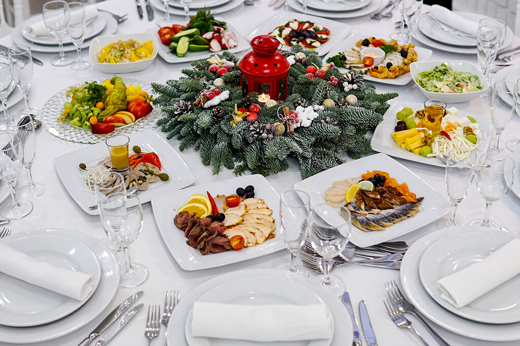 Лучше всего составить меню заранее и включить в него закуски (салаты, тарталетки, бутерброды, всевозможная нарезка), горячее (различные блюда, кроме говядины и кролика), гарнир (картофель, рис, крупы), десерты и напитки.