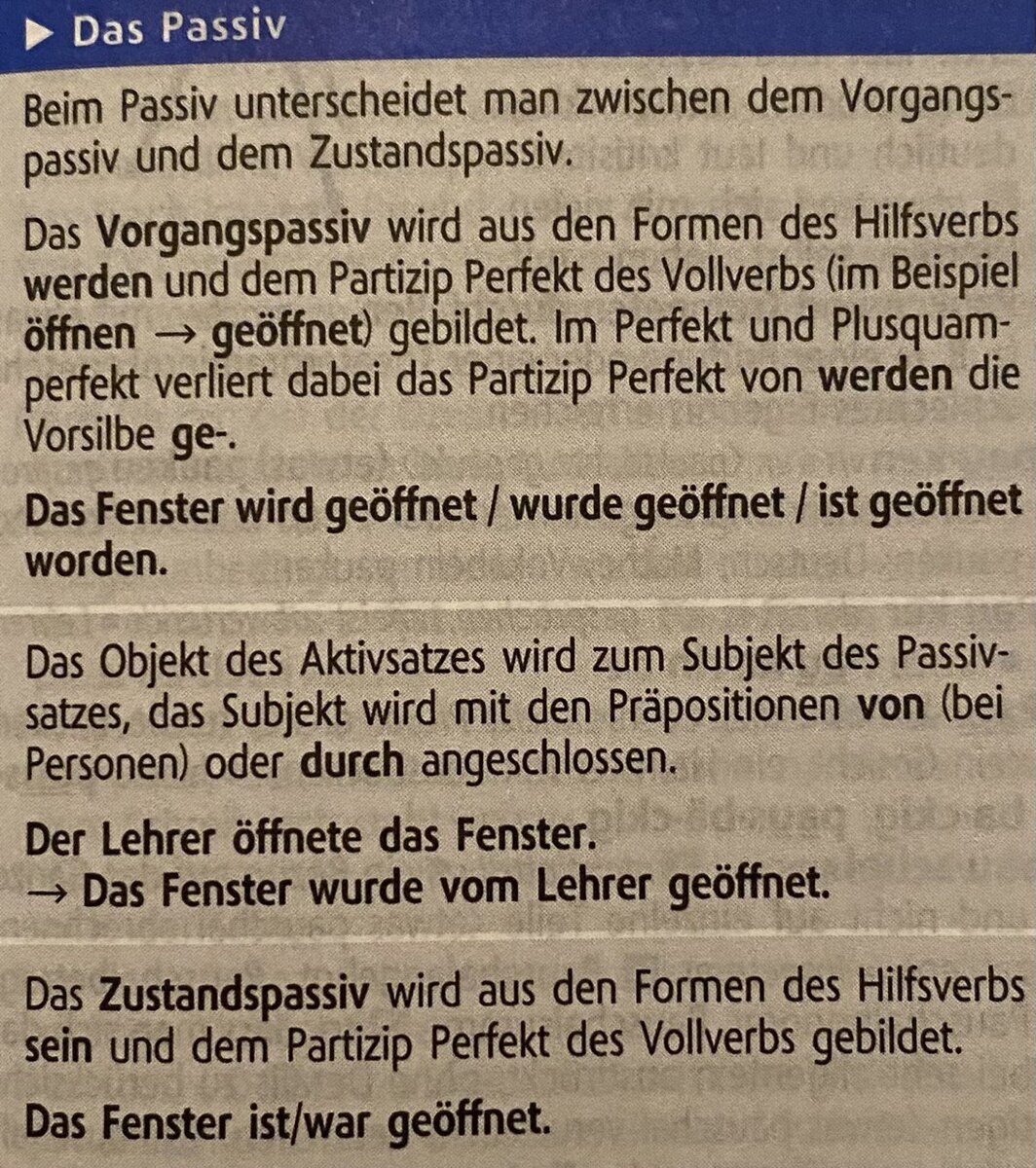 В этом очерке расскажу как образуется пассивный залог. Активный залог это предложение, в котором подлежащие выполняет действие: "Я строю дом / Ich baue das Haus", а в пассивном залоге над подлежащим выполняют действие: "Дом строится / дом строят / Das Haus wird gebaut". Пассивный залог можно образовывать только от переходных глаголов, это такие глаголы которые имею дополнение в аккузативе, т.е. в винительном падеже. Когда мы из активного залога делаем пассивный, то дополнение в аккузативе в активно залоге становится подлежащим в пассивном залоге. "Дом" в предложении выше как раз и является дополнением в винительном падеже. Если в пассиве есть необходимость указать источник действия, т.е. то, что было подлежащим в активном залоге, то его присоединяют с помощью предлога "von": das Haus wird von mir (ich => von mir) gebaut. В немецком есть два вида пассива: описывающее процесс или состояние. Процесс = Vorgangspassiv => werden + Partizip 2 1. Präsens: Es wird gebaut 2. Präteritum: Es wu