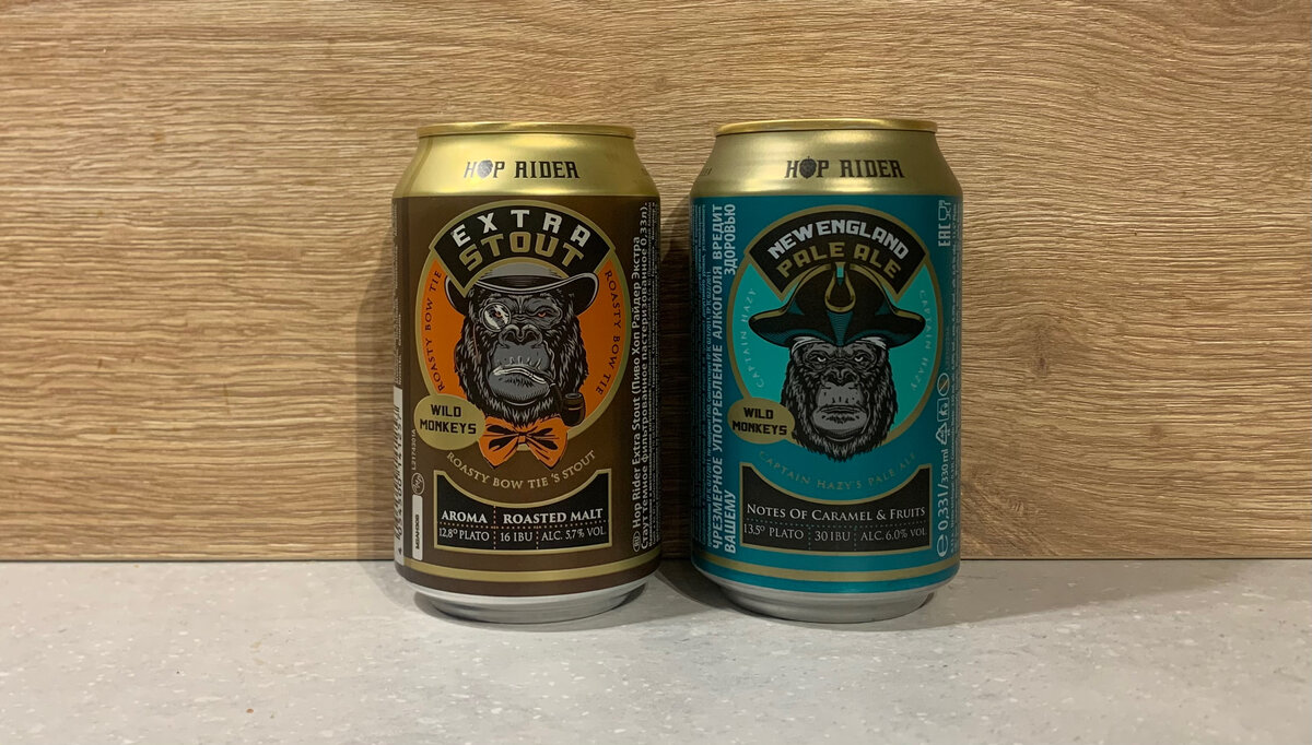 Когда я был совсем маленьким мальчиком мама мне рассказывала истории про двух обезьянок, Альфонсика и Гонзика. Теперь я вырос и пришла пора закрывать гештальт - во "взрослом" "Красном и Белом" были куплены две обезьяны, Extra Stout и New England Pale Ale. Если мое знание биологии меня не подводит, то на банках нарисованы гориллы. Начнем со стаута, как и вся серия Hop Raider с обезьянами, он был сварен на немецкой пивоварне Privatbrauerei Eichenbaum в городе Мангейм, и это не единственная их линейка, которая доступна в России. В составе Extra Stout: вода, ячменный солод, экстракт хмеля. Цена - 49,99 за баночку 0,33. Больше всего привлекает предложение на банке "После вскрытия сразу употребить". Вскрываем и начинаем употреблять... Пенная шапка приличного размера и она стойкая, цвет - темно-коричневый, крепость - 5,7%. Сладковатый, карамельный аромат, похожий на квасной. Вкус ассоциируется с чем-то типа "копченого кваса", горечи почти не ощущается (она указана как 16 IBU), напиток водя