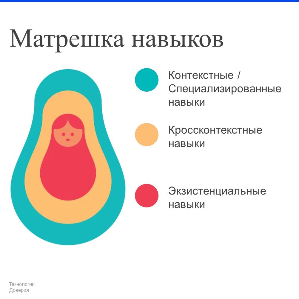Кажется, что технические, но это не так. Мы в технологической практике ТеДо ориентируемся на «матрешку» навыков, представленную в исследовании «Навыки будущего» Global Education Futures и WorldSkills Russia. Подробнее о матрешке рассказывает Марина Кубанина, руководитель продуктовой разработки технологий искусственного интеллекта в ТеДо. Из чего состоит «матрешка» навыков: