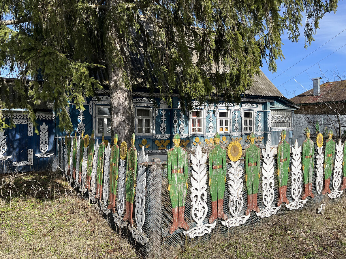 Остановился, фотографирую солдатиков в зелёной форме, подхожу к дому, рассматриваю резные узоры. В этот момент в окно стучит мужчина и активно машет рукой.