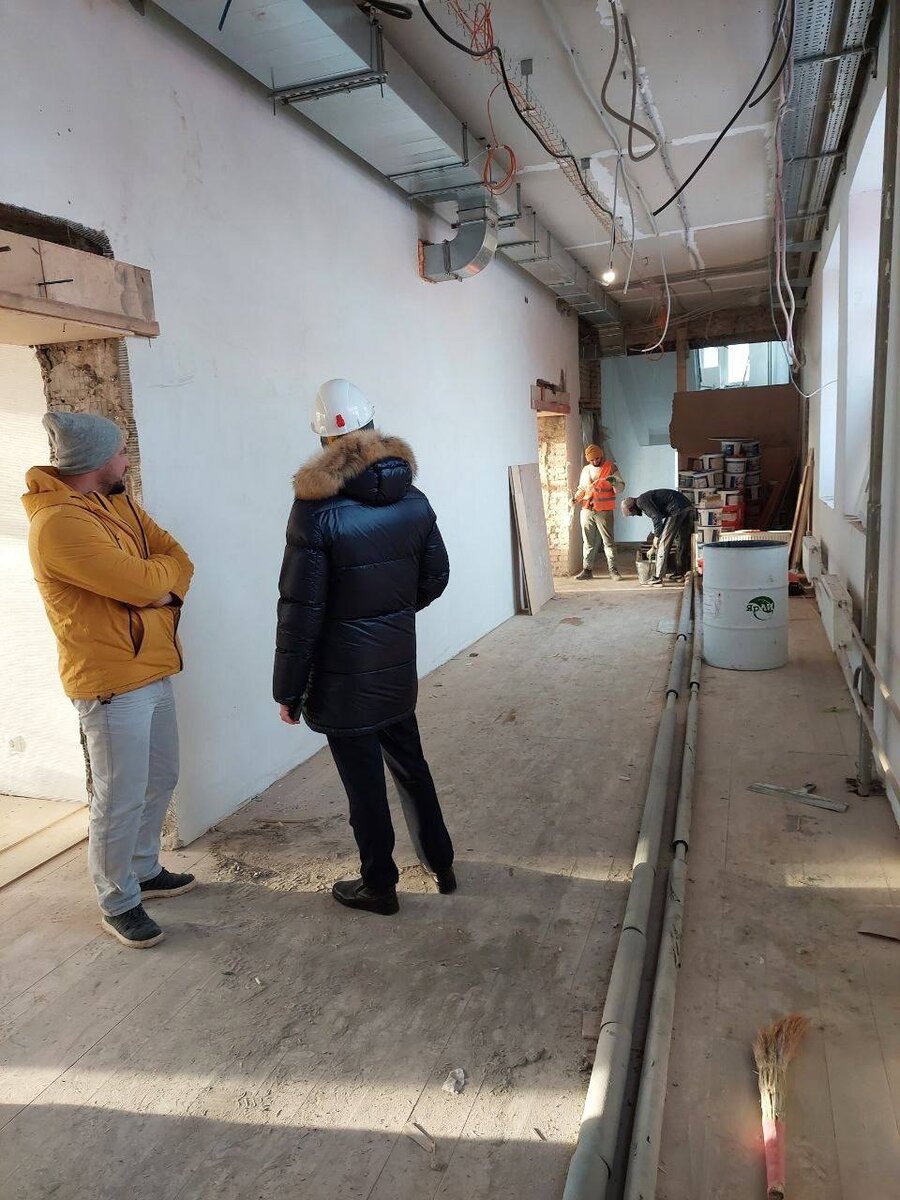 черновой отделки актового зала и пищеблока. На первом этаже идет подготовка полов перед заливкой бетонной стяжки», — сказал он.