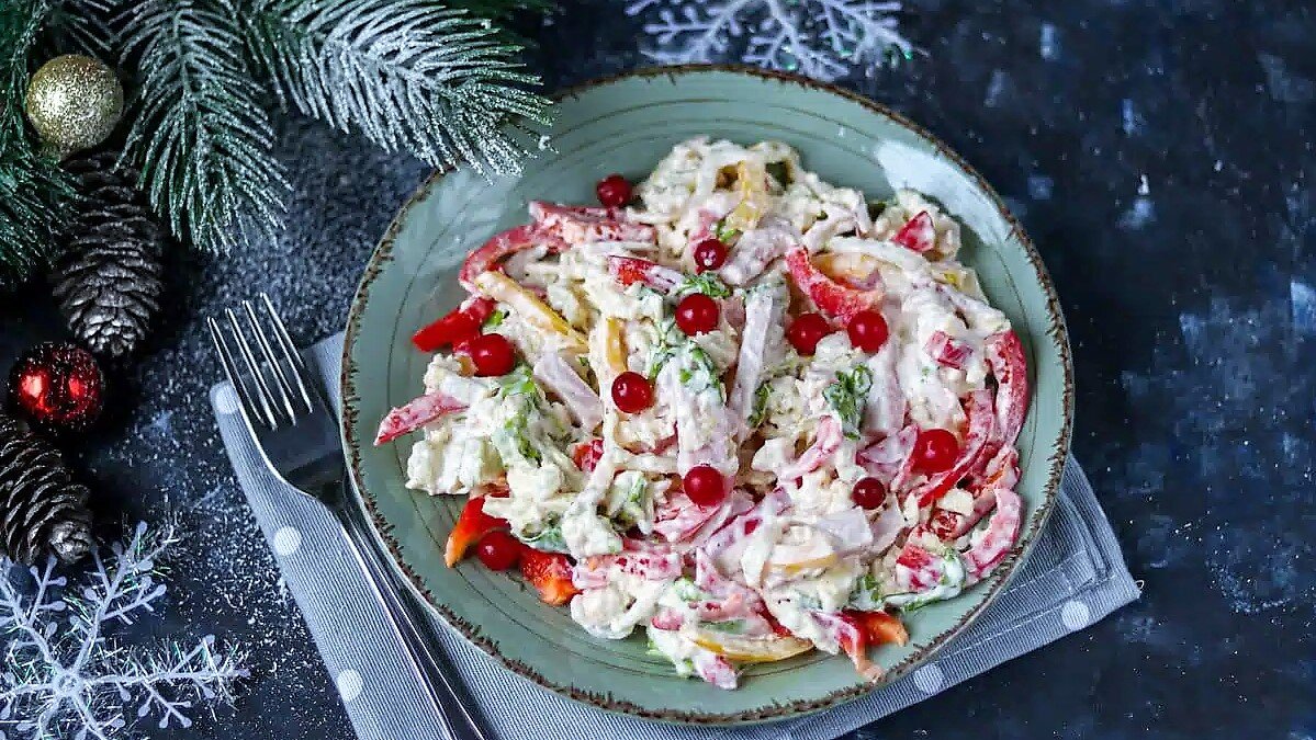 Отличный салат из пекинской капусты, сыра и ветчины с сочной клюквой будет прекрасно смотреться на новогоднем столе. Время приготовления: 15 мин. Пошаговый рецепт: Быстрый салат из пекинской капусты: ШАГ 1: Нарежьте перец, пекинскую капусту и ветчину соломкой. ШАГ 2: Мелко натрите сыр. Очистите и мелко нарежьте чеснок. ШАГ 3: Смешайте овощи, сыр, ветчину и чеснок. ШАГ 4: Заправьте салат из пекинской капусты майонезом и украсьте клюквой. Приятного аппетита и прекрасного настроения! Ингредиенты: Друзья, ставьте лайк👍 и подписывайтесь на канал😍, чтобы не пропустить новые рецепты!