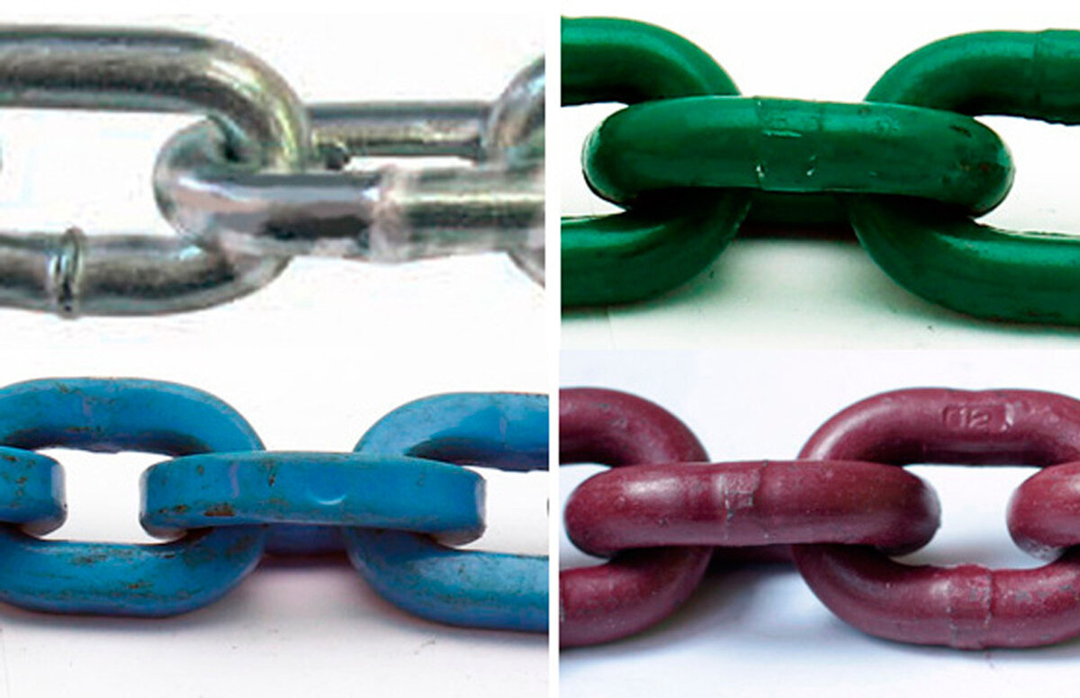 В плане защиты от кражи строительные цепи, в отличие от высокопрочных, абсолютно бесполезны, они могут успешно противостоять разве что кусачкам или ножницам по металлу. Но, после покупки цепи или велозамка с цепью, мало кто отважится попробовать цепь на прочность болторезом, т.к. в этом случае он хоть и выяснит, что именно приобрел, но возможно лишится средства защиты, за которое выложил приличную сумму. Поэтому есть смысл перед покупкой по внешним признакам выяснить, что же за цепь перед вами? Покрытие Они практически всегда оцинкованы, блестящие, весят столько же, сколько и высокопрочные; и геометрические размеры у них такие же, как и у высокопрочных. Цепи класса G80 (8 класс прочности) в 90% случаев поставляются в технологической смазке (для того, чтобы цепь не была хрупкой после закалки, ее подвергают процессу "отпуска", погружая в раскаленном виде на несколько часов в масло). После этого цепь приобретает черный цвет. Поэтому, если ваша цепь черного цвета, в масле и пачкается, у в