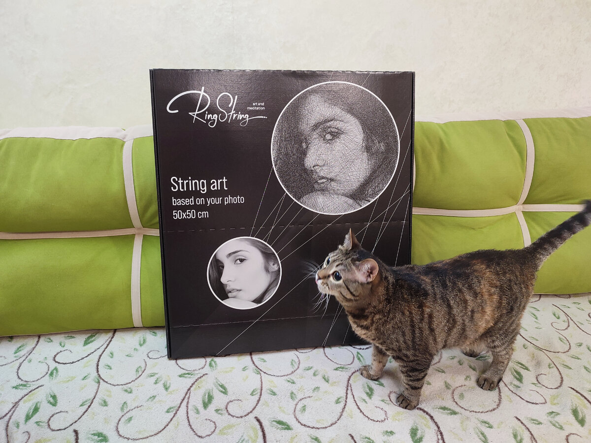 Этот подарок мужа меня очень удивил, он был неожиданным. Вроде Новый год еще не наступил 😂 Он знает, что рукодельничать я не люблю, а вот занятия вечером чем-то простым типа сбора пазла или алмазной мозаики мне по душе. Я таким образом расслабляюсь)) Вот и решил меня одарить чем-то подобным. Увидел в интернете ролик набора для создания картины из нитей, которую можно создать из любой фотографии. Решил, что мне тоже понравится, заказал. И в целом угадал 😊 Вот такую красивую и большую коробку привезли на дом: Что это такое Я впервые вообще вижу такой вариант, так сказать, продвинутого рукоделия. Это очень необычно, нестандартно. Действием руководит голос. Скачивать ничего не нужно, инструкция запускается прямо на сайте RingString. В коробке основа для сборки картины с гвоздиками по окружности (на них наматываются нити в процессе), катушка с нитью и сборная деревянная подставка для нее. Еще есть весьма стильная подставка для телефона. Также прилагается подробная инструкция в стиле "для