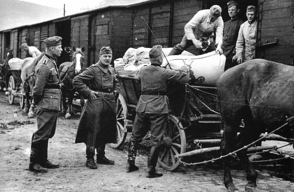 Во время оккупации советской территории на Запад потянулись многочисленные эшелоны с награбленным. Это гитлеровцы вывозили из СССР оборудование заводов, фабрик, сельхозтехнику, стройматериалы, металл, уголь и руду, нефть, зерно и скот. Сотни тонн посылок от немецких солдат и офицеров ехали в Германию в почтовых поездах. Нужно было материально стимулировать патриотический настрой жителей Рейха, показать им, что война это благо и счастье для народа. Это счастье за чужой счет вышло боком. И когда советский солдат вступил на территорию огрызающейся нацистской Германии, уже тогда в Советский Союз стали отправлять первые эшелоны с возвращенным добром и экспроприированным имуществом врага. Уже в начале весны 1945 года советские специалисты приступили к демонтажу и отправке в СССР станков карбидного завода из г.Бейтен, оборудование химического завода г. Аммендорф, в т.ч. его котельную и электростанцию. Вывозилось оборудование немецких заводов, производивших танковые бронированные корпуса,