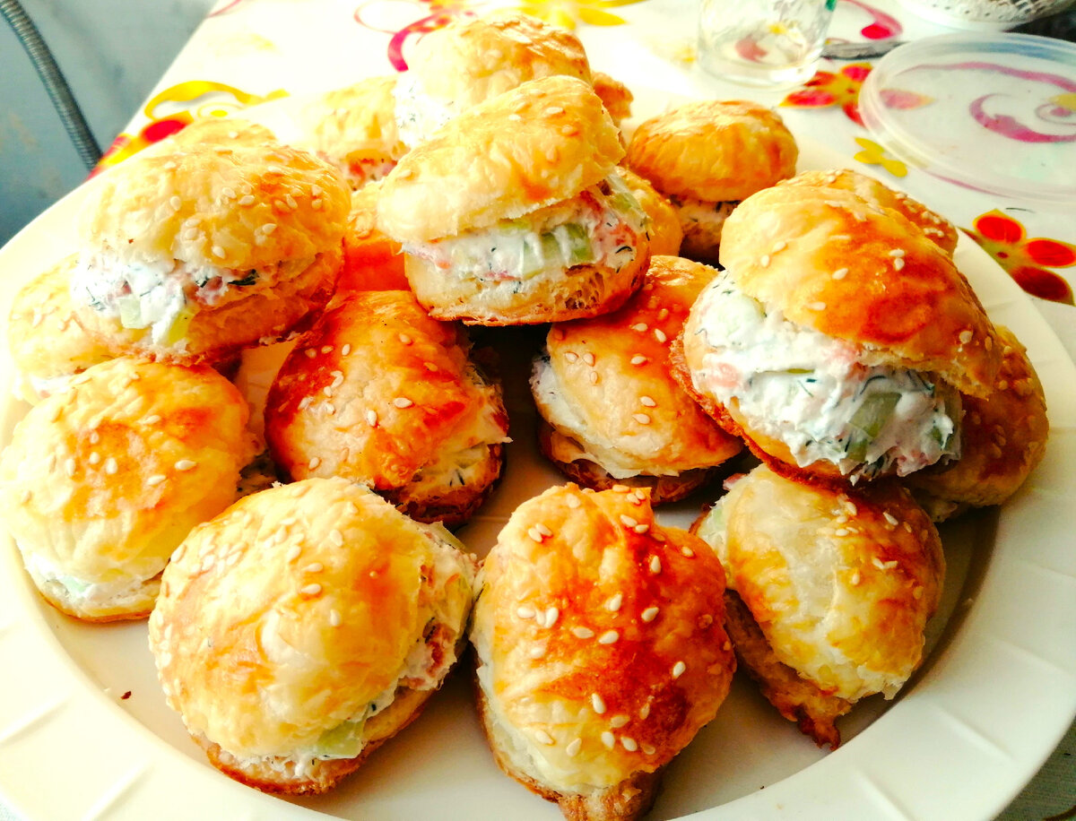 в некотором царстве, в некотором госуд.... ой о чем это я:) Мда и такое бывает когда в голове куча идей. Ну, что ж мои дорогие ловите рецепт вкусной закуски на праздничный стол, а собственно говоря можно и так просто сделать, и поесть, самое главное, что это быстро и вкусно! Для приготовления нам понадобится: 1. Слоеное бездрожжевое тесто; 2. Красная рыбка (форель, лосось...) на Ваш вкус; 3. Свежие огурцы; 4. Творожный сыр; 5. Укроп; 6. Яйцо; 7. Кунжут. Способ приготовления: Слоеное тесто немного раскатать и стопочкой выдавить кружочки, затем на противень с пергаментом их выложить, смазать яйцом и посыпать кунжутом. В Разогретую до 200°С духовку отправить противень, выпекать до готовности. Пока делаются слойки готовим салат: Нарезаем некрупно рыбу, огурцы, укроп, все смешиваем с творожным сыром ( если сыр твердый можно добавить немного сметаны или майонеза, так будет легче все перемешать). Остывшие готовые слойки разрезаем пополам, но не до конца. И во внутрь каждой слоечки ложим сала