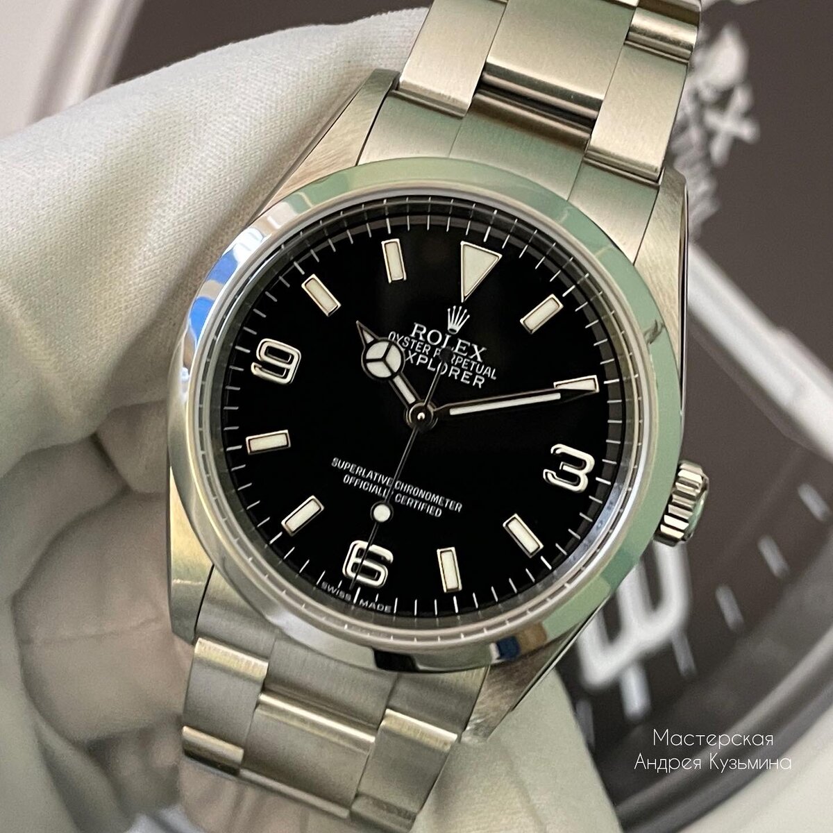 Добрый день друзья и читатели моего канала! Компания Rolex еще с 1930-х годов оснащала довольно много экспедиций часами Oyster. И вот, спустя множество экспедиций и альпинистских достижений, были собраны специальные знания для создания профессиональной модели часов для исследователей - Explorer. Презентация первой модели часов Explorer была в 1953 году, в том же году, когда была произведена успешная экспедиция на Эверест (сэр Эдмунд Хиллари и Тенцинг Норгей первыми взошли на высочайшую вершину мира под руководством сэра Джона Ханта). Конечно, модель Explorer постоянно совершенствовалась и улучшалась (корпус становился прочнее, повысилась четкость читаемости показаний на циферблате), но внешний вид часов оставляли неизменным. Теперь расскажу поконкретнее о модели часов, которая побывала у меня в мастерской. Rolex Explorer - универсальная модель часов, подойдет как на деловую встречу, так и для повседневной жизни. Корпус и браслет часов выполнены из стали. Механика с автоподзаводом.