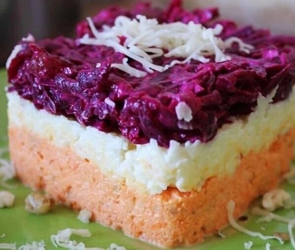 Ингредиенты: - Свекла — 2 шт - Сыр твердый — 150 гр - Изюм — 1 горсть - Морковь — 3 шт - Чеснок — 3 зубка - Орехи грецкие — 1 горсть - Майонез - Чернослив — 1 горсть ⠀ Приготовление: Свеклу, морковь отварить. Затем сваренные продукты потереть на мелкой терке. При этом все ингредиенты следует тереть в отельные тарелки. Сыр потереть также на мелкой терке. Чеснок следует выдавить, орехи измельчить. Изюм и чернослив необходимо распарить, для этого просто опустите их по отдельности, на несколько минут в кипяток. Для того, чтобы придать салату красивую и аппетитную форму, необходимо собрать его по слоям: 1-ый слой – морковь перемешайте с майонезом и изюмом (можно просто смазать этот слой майонезом, но если перемешать, будет вкуснее). 2-ой слой – перемешать майонез, чеснок и сыр. 3-ий слой включает в себя свеклу, чернослив (порезать), орехи (измельчить) и майонез. Все ингредиенты необходимо тщательно перемешать. Всё, наш салат готов. Приятного аппетита.