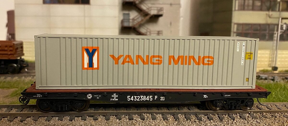Ещё один вагон-контейнеровоз модели 13-401 в масштабе 1:87. Собран из кита производства Bergs, хотя таких китов официально в продаже никогда не было. Список работ и доработок получился в целом аналогичный тем, что были сделаны для другого контейнеровоза, с небольшим отличием в части сцепок:
