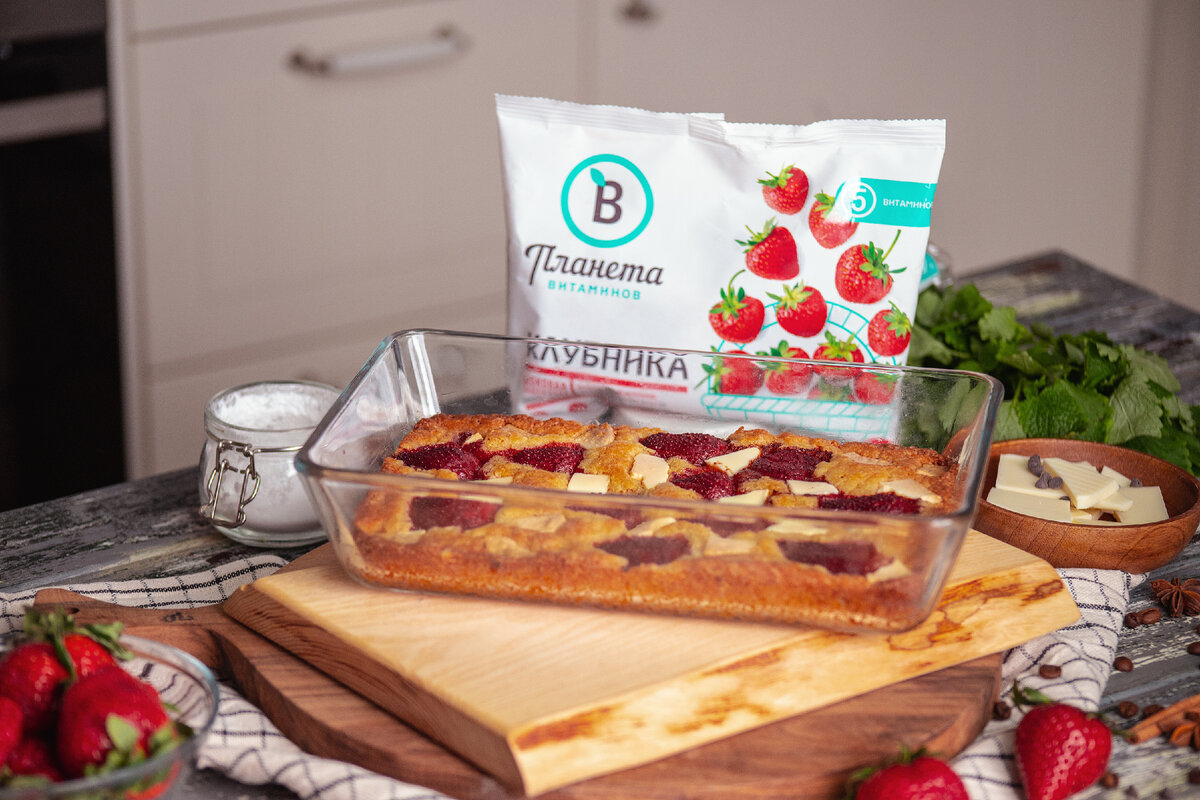 Пирог не замысловат, но вкусный, симпатичный и ароматный! Видеорецепт ждёт вас внизу страницы ⤵️ Ингредиенты: Замороженная клубника 200 г Сливочное масло 150 г Коричневый сахар ¾ ст Яйцо 1 шт Ванилин 1 ч л Мука 1 ст Разрыхлитель ½ ч л Соль ¼ ч л Белый шоколад 90 г Подписывайтесь на наш канал- вас ждут простые проверенные рецепты салатов, горячих и холодных блюд, множество десертов и закусок каждый день в разных форматах! Выбирайте удобный для вас. Мы в Телеграм, вконтакте, Instagram* и Facebook* Где купить товары "Планета Витаминов"? Рецепт: 🍓РЕЦЕПТ: 1. Разогреть духовку до 200° С. 2. Растопить масло. 3. Добавить коричневый сахар. 4. Добавить яйцо, ванилин, муку, разрыхлитель, соль и перемешать до однородной массы. 5. Выстелить форму для выпечки пергаментной бумагой. Смазать пергамент и бортики маслом. 6. Распределить тесто по форме. 7. Выложить клубнику и кусочки белого шоколада. 8.Выпекать от 25 до 30 минут. Края должны выглядеть твердыми и хорошо пропеченными, центр должен