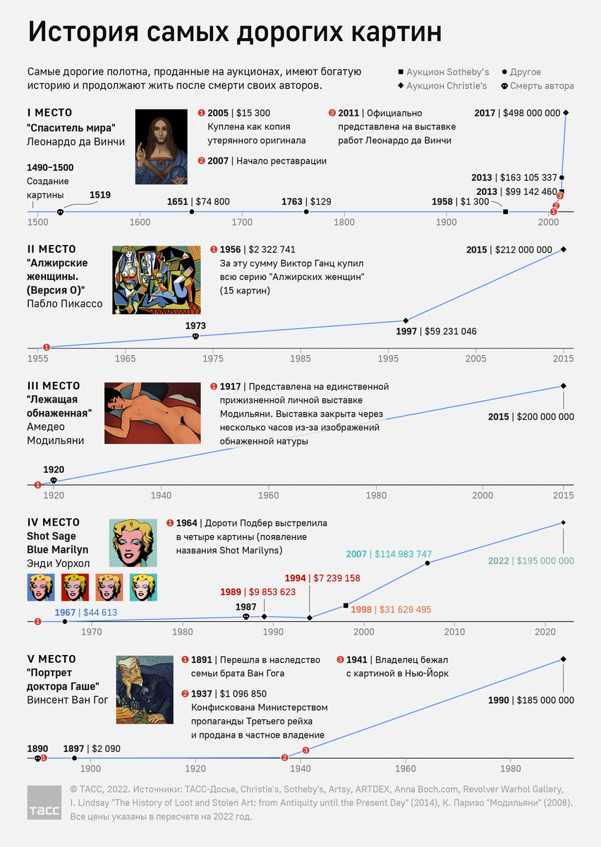 8 декабря отмечают Международный день художника. Этот праздник — повод вспомнить историю жизни творцов и судьбу их полотен. За последние 20 лет было поставлено несколько рекордов по продаже картин на аукционах. Самая дорогая картина "Спаситель мира" Леонардо да Винчи сначала находилась во владении английских монархов. Затем была утеряна почти на 140 лет, а после обнаружения считалась копией оригинала или работой последователя художника. Только в 2011 году "Спаситель мира" был официально представлен как картина да Винчи и через шесть лет продан на аукционе за рекордную сумму в $489 млн (в ценах 2022 года). На втором месте по стоимости находится работа Пабло Пикассо "Алжирские женщины. (Версия О)". При жизни художника все 15 картин из серии были проданы за $2,3 млн (в ценах 2022 года), что в 91 раз меньше, чем сумма продажи "Версии О" в 2015 году. Работа Винсента Ван Гога "Портрет доктора Гаше" в 1937 году была конфискована Министерством народного просвещения и пропаганды Третьего рейха,