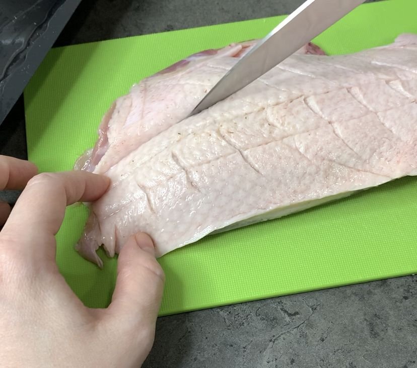 Можно ли приготовить так же вкусно и подать так же празднично и красиво, как в ресторане? Конечно, да! И это совсем не сложно, как может сначала показаться. Предлагаю вам приготовить праздничную утиную грудку и оформить ее гарниром из карамельных яблочек, а дополнить все соусом из апельсинов с корицей. Блюдо рассчитано на двоих, поэтому сохраняйте рецепт для романтического ужина. Меня зовут Оксана, я собрала для своих подписчиков сборник с салатами на праздничный стол. Каждый месяц я делаю новые подборки с рецептами. Подписывайтесь на канал и обновляйте страницу, чтобы увидеть закрепленный пост с подборкой. Для приготовления нужно взять два утиных филе на коже. Острым ножом надрезать кожу, не касаясь мяса, сначала вдоль, потом поперек. Это необходимо сделать, чтобы жир лучше растапливался. Поставить нагреваться духовой шкаф на 180 гр., он нам понадобится позже. Нагреть сковороду и насыпать щепотку крупной соли и дробленого перца. Сковорода должна быть сухая, без масла. Выложить утиное