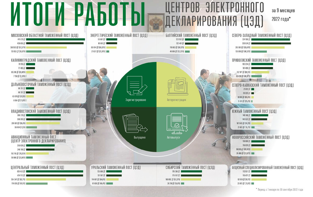 За 9 месяцев 2022 года Центральным ЦЭД зарегистрировано 428 453 ДТ, выпущено 424 133 декларации на товары (ДТ). Без участия таможенного инспектора зарегистрированы 354 347 ДТ (82,7%), среднее время авторегистрации деклараций составило 13 секунд. Прошли алгоритм автоматического выпуска 176 035 ДТ (41,5%). Такие декларации выпускались в среднем за 26 секунд.