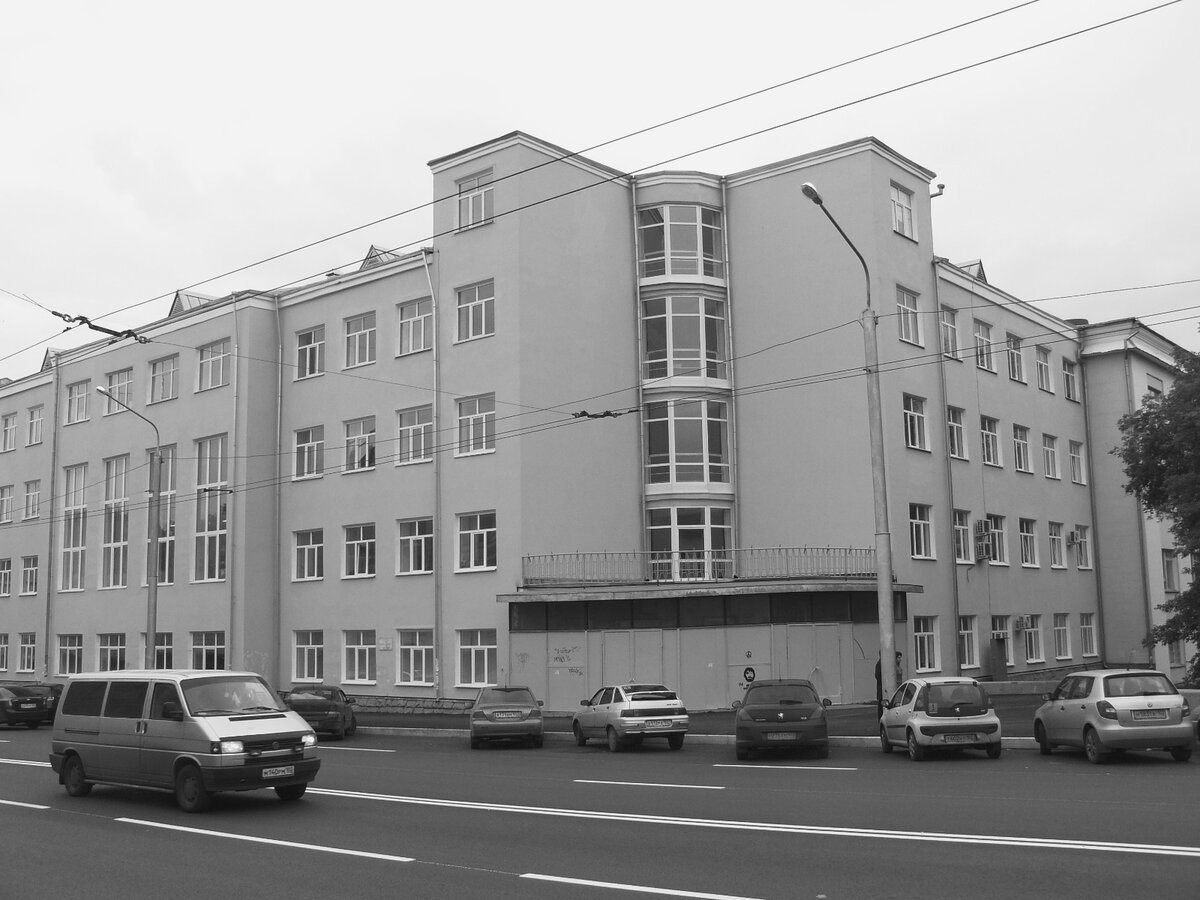 С левой стороны на значительное расстояние от фасада отстоит ризалит: этот приём обеспечил приращение площади для размещения двухсветного актового зала. Квадратные опоры ризалита, ставшие элементом монументального обрамления входа в здание, переходят в пилястры, ритмично поделившие остекление торжественного фасада актового зала. Правый ризалит, примыкающий вплотную к ранее существовавшей застройке, увеличил площадь той части здания, где разместили квартиры со всеми удобствами.