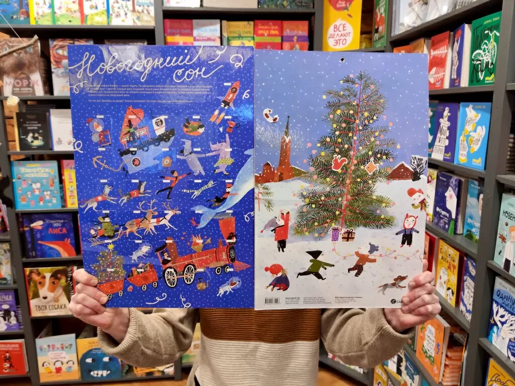 Казалось бы, опять все эти новогодние декорации, к которым все привыкли. Опять адвент-календари. Но – глядите! – они снова отправляют нас в счастливый детский новогодний сон. Как бы что здесь? Новогодние штуки, к которым мы все привыкли – зимние радости. Но на самом деле там всё удивительное, неожиданное, прямо из детства, или из мечты или детского сна. Можно даже не ходить далеко, а всего лишь найти потерянную шапку. Ну, или потерять её в новогоднем переполохе – и никто не будет ругать, это ведь знак того, что зимняя сказка действительно удалась! И это не просто слова. Всё это, и ещё многое, происходит с героями адвент-календаря Юлии Сидневой «Новогодний сон». Большой, красивый, в окошках прячутся герои историй про новогодний поезд, и у них есть для нас 31 маленький квест. Так что каждый день принесёт одно задание (с наклейкой). Наклейки нужно будет наклеивать на постер (он с обратной стороны календаря). Это чтобы календарь радовал нас весь год! Квесты с заданиями придумала наша Лена