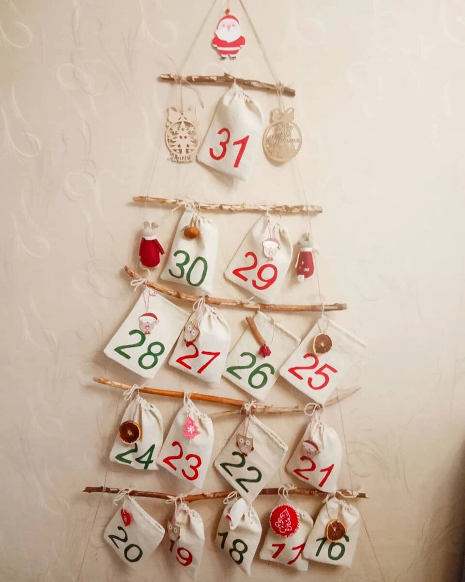 Уже третий год 16 декабря я вешаю для детей такой Адвент Календарь. Почему с 16? Просто у моего мужа день рождения 15 декабря и уже после начинается подготовка к Новому году. И ёлку мы наряжаем 16 числа, она искусственная. А 31 декабря в подарок детям идут новогодние пижамки. Надо их успеть сшить) Сшила его из остатка бязи, который нашла в кладовке при переезде). Шьётся он очень просто и быстро даже для начинающих, в мешочек вставлена самая простая нитка доя вязания. Ветки нашли рядом в парке. Цифры нарисовала акриловой краской и прогладила с внутренней стороны. Конструкция легко разбирается, палки мы храним в коробке с ёлкой, а мешочки просто отвязываются. Висит на одном гвоздике, так как достаточно лёгкая. В каждом мешочке небольшие сюрпризы для детей (сладкие или нет) и задание, связанное с украшением дома или настроением (вырезать снежинки, повесить гирлянды, посмотреть новогодний мультфильм или испечь печенье). Детям очень нравится! Здорово, когда есть такие традиции, это оч