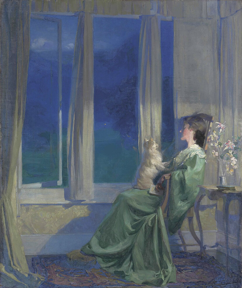 Фрэнк Брэмли был английским художником-постимпрессионистом, который специализировался на интерьерах и работал, сочетая натуральный и искусственный свет в своих картинах. Он был пионером "техники квадратной кисти". В этой технике он использовал плоскую часть квадратной кисти для того, чтобы наносить краску на холст зигзагообразными мазками, что придавало особую энергию окрашенной поверхности. Считается, что женщина на картине - это жена Брэмли, Кэтрин Грэхам, которая также была художницей. Она сидит в кресле, возможно, в их доме Орчед-Коттедж (Orchard Cottage), который тогда назывался Бель-Вю-Коттедж (Belle Vue Cottage).