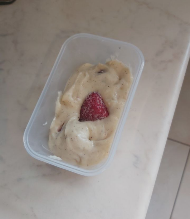 Разрезаем и делаем в стакане сметану 10% с сах замом, крем. Поливаем и наслаждаемся.