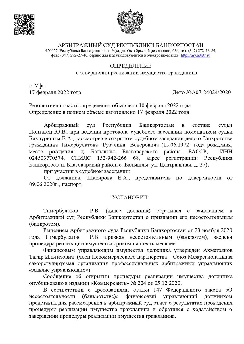 В декабре 2020 года к нам обратился Рузалин Венерович, военный в отставке из села Балышлы Благоварского района Республики Башкортостан. Его долг составлял 1 419 000 руб. Это были потребительские кредиты в Росбанке и кредиты на рефинансирование. Нюанс - деньги на рефинансирование, на момент обращения к нам, не были потрачены, лежали в полном объеме на счету. Причина обращения в нашу компанию: Рузалин успешно выплачивал свои кредиты и не задумывался о списании, но случилась беда – он заболел раком почек и готовился к госпитализации. Естественно, при всем желании, ни о каком погашении кредитов не могло быть и речи. Мы начали выполнять свою работу. В ходе дела, у Рузалина случилась еще одна неприятность – в доме, в котором он проживал, прорвало котел, и потребовался срочный ремонт. Рузалин сделал ремонт на деньги, которые предназначались на рефинансирование. Мы собрали документы и подали в суд. 23 ноября 2020 года Арбитражный суд признал Рузалина Венеровича банкротом и ввел процедуру реали