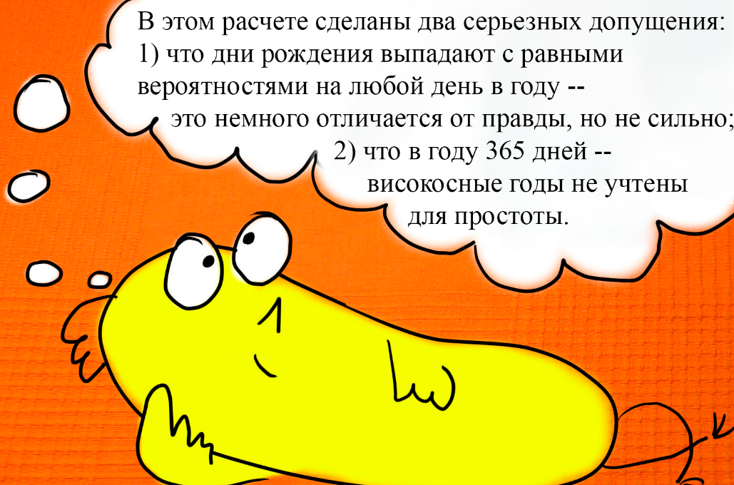 Отсчет дней до Нового Года начался не сегодня, а раньше: 24, 25, ... Насчет числа 23 даже сомнений не было, какой математический сюжет для него выбрать: это парадокс дней рождения. О чём это? Соберем вместе несколько человек и посчитаем вероятность того, что хотя бы у двух из них дни рождения совпадают. Она зависит от того, что такое "несколько". Если "несколько" -- это просто 2, то вероятность невелика, она равна примерно 1/365. И правда, пусть собрались Корней с Пантелеем: день рождения Пантелея может приходиться или на день рождения Корнея, или на любой из 364 оставшихся дней года, поэтому вероятность и получается 1/365. Понятно, что чем больше людей собрать вместе, тем больше вероятность совпадения. Соберем, скажем, 367 человек. У всех них дни рождения не могут быть разными, значит, хотя бы у двоих совпадают, -- вероятность этого 1. А сколько надо набрать народу, чтобы с вероятностью не меньше 1/2 нашлись двое с одним днем рождения? Если заранее не знать ответ, то скорее всего,