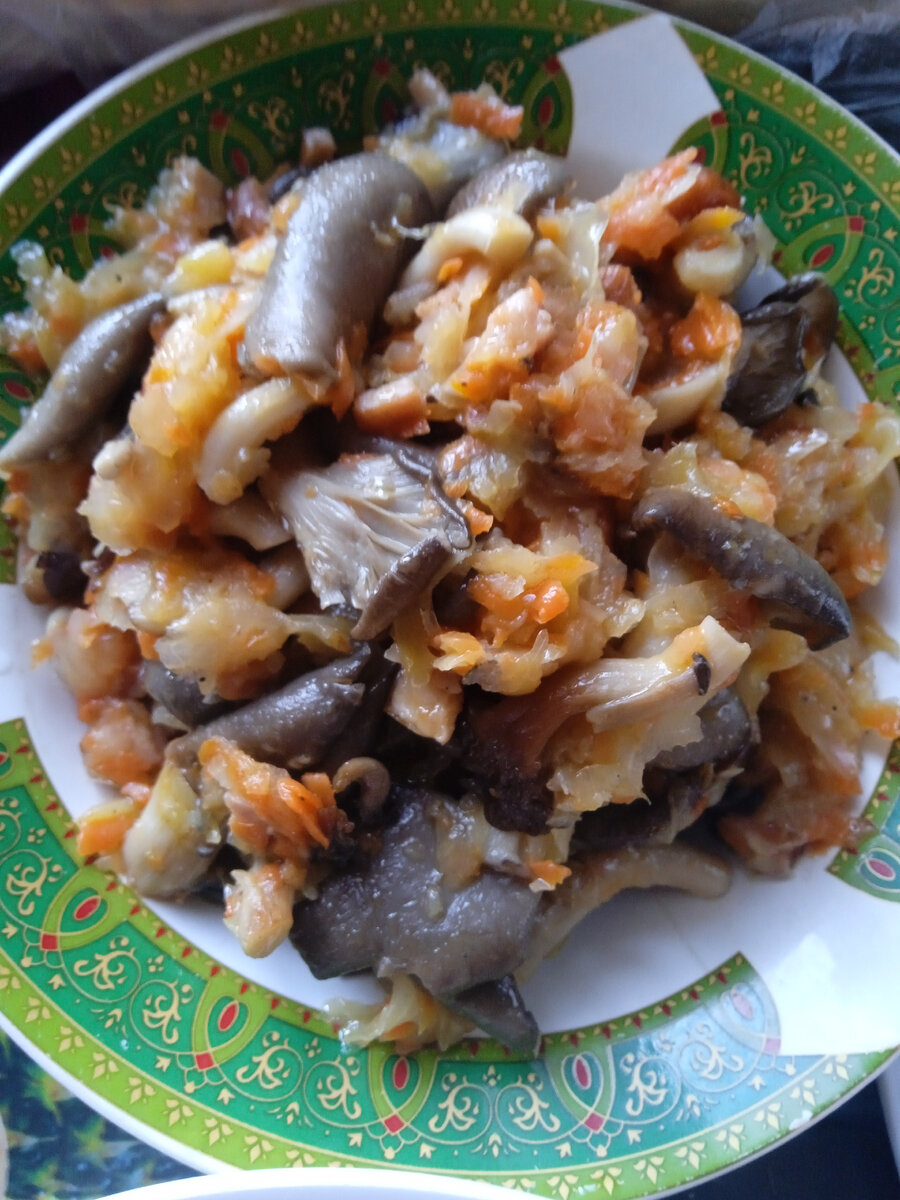 Ингредиенты: -грибы вешенки (200 грамм) -капуста квашенная 200 грамм -1 большая морковь -1 луковица -сливочное масло столовая ложка -веточка укропа -перец чёрный горошком -болгарский перец красный 1 штука -помидр свежий 1 штука -томатный соус 1 столовая ложка -любое варёное мясо 100 грамм (я использую куриную грудку) Приготовление: Нарезать грибы на одинаковые кусочки. По размеры кусочки должны быть примерно по 5 сантиметров. На сковороде на растопленном сливочном масле пожарить грибы. Приготовить ещё одну сководку. Поставить её на плиту и растопить в ней сливочное масло. Мелко нарезать лук и морковь. Пожарить лук с морковкой. Поставить на плиту ещё одну сковородку. На третьей сковороде потушить квашеную капусту под крышкой. Всё довести до готовности, затем соеденить в большой ёмкости. Мелко нарезать предварительно отваренное мясо. Я использовала куриную грудку. Добавить томатную пасту, мясо, мелко порубленную зелень, красный перец, и мелко порубленные помидоры. Тчательно перемеша