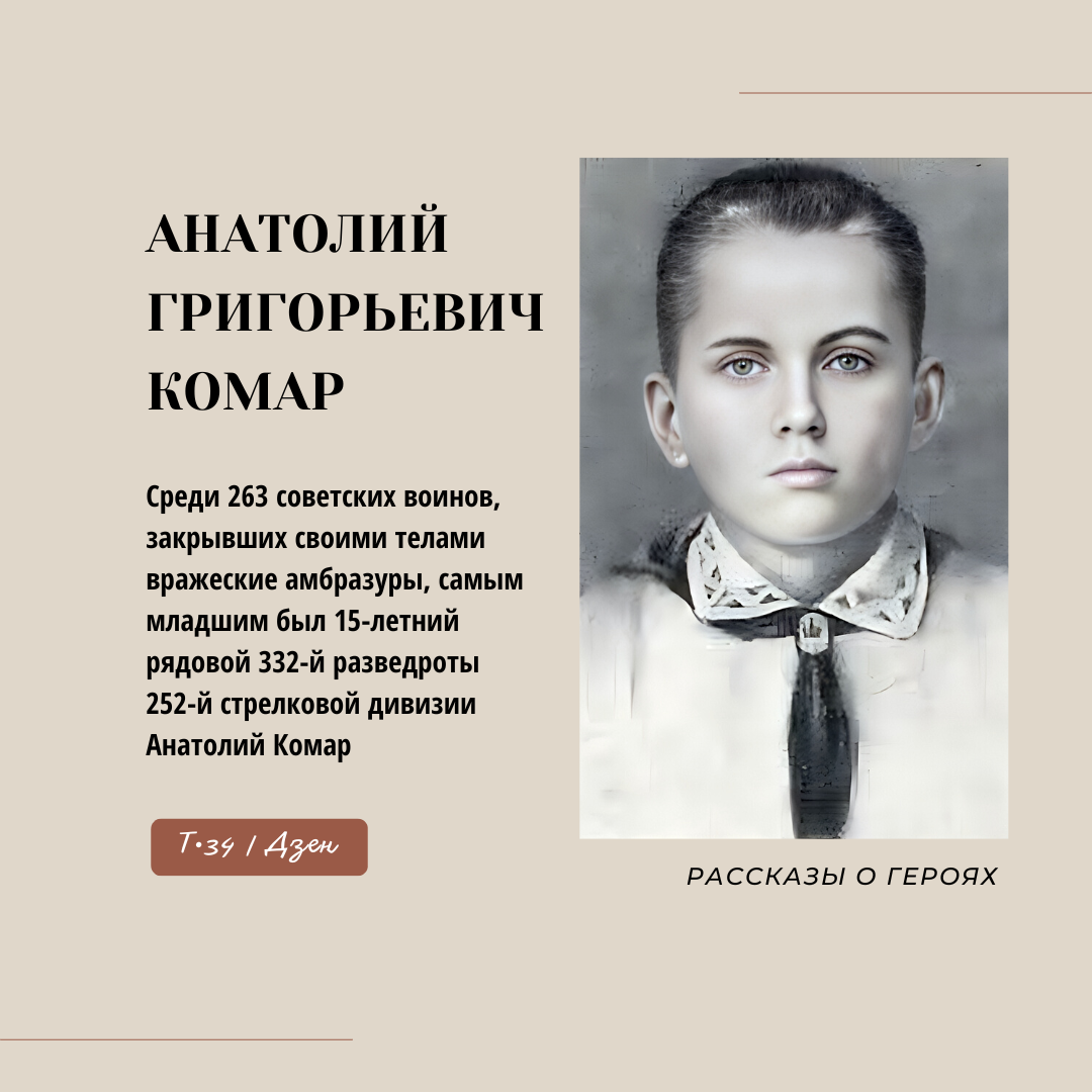 С небольшой фотографии смотрят внимательные, живые глаза мальчика. Молва о его подвиге прокатилась по всей Украине. Посмертно Толя Комар был награждён орденом Отечественной войны I степени.