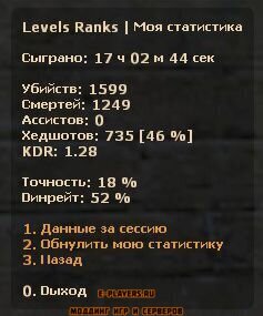 stats - сбросит данные о статистике (`kills`, `deaths`, `shoots`, `hits`, `headshots`, `assists`, `round_win`, `round_lose`). sm_lvl_del <ник игр