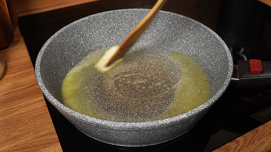 Способ приготовления: Растапливаем сливочное масло на сковороде. Нарезаем луковицу. Обжариваем ее до мягкости и золотистого цвета. Нарезаем красный перец, и нарезаем зеленый перец. Добавляем в сковороду и обжариваем 3-5 минут на сковороде.