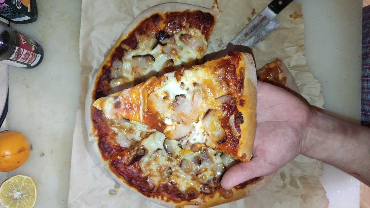 Тесто: Мука 600 гр. Вода 200 мл. Яица с2 2шт. Дрожжи 8 гр. Сахар 50 гр. Соль 5 гр. Масло растительное 50 мл. Начинка: Грудинка копченая Сыр моцарелла Томатный соус Лук репчатый Рецепт: В воде развести сахар и дрожжи и дать активироваться дрожжам до плотной пены. В муку добавить яица, соль, растительное масло и разведённые дрожжи. Замесить тесто и оставить в теплом месте на час. Обмять тесто и оставить ещё на 45 минут. Руками сделать основу для пиццы толщиной 1 сантиметр. На основу нанести томатный соус, посыпать репчатым луком, посыпать тёртой моцареллой, выложить грудинку и посыпать ещё моцареллой. Дать расстояться 15 минут пока греется духовка. Выпекать при 180 градусах 20-25 минут. Приятного аппетита!