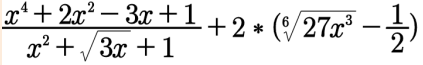 Преобразования алгебраических выражений встречаются везде. Ведь часто и в математике, и в физике при решении определенной задачи мы получаем огромное и сложное алгебраическое выражение, с которым неудобно работать. Поэтому мы должны уметь преобразовывать подобные "крокодильчики", чтобы потом с ними было легче работать. Итак, вот наш пример. Для удобства обозначим первую дробь A, а выражение в скобках B. Таким образом наше выражение примет вид: A+2B В знаменателе выражения A (первой дроби) есть X под корнем. Следовательно, X больше либо равен нулю X≥0. Теперь преобразуем выражение А: Выражение x⁴+2x²+1 в числителе мы свернули в полный квадрат по формуле a²+2ab+b²=(a+b)² Дальше мы видим, что знаменатель содержит √3x, а в числителе есть просто 3x. Занесем 3x под корень (имеем право это сделать, так как сначала прописали условие, что x≥0). Получается 3x=(√3x)² Итого в числителе мы получили (x²+1)²-(√3x)². Разложим на множители по формуле a²-b²=(a-b)(a+b). Сократим одинаковые выражения в чи