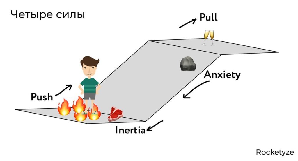 В JTBD есть такая штука — “4 силы”. Это силы, которые влияют на потребителя, когда он переключается с одного продукта на другой: