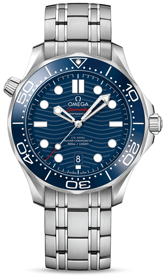 Часы Seamaster Professional Diver 300M, появившиеся на свет в 1993 году, привлекли внимание огромного количества ценителей часового искусства. Нынешняя коллекция вобрала в себя знаменитое океанское наследие, привнеся в него лучшие инновации и дизайнерские решения OMEGA. Эта модель диаметром 42 мм в корпусе из нержавеющей стали имеет синий керамический безель с дайверской шкалой из белой эмали. На циферблате из полированной синей керамики лазером выгравирован волнообразный узор, а в положении "6 часов" находится окошко указателя даты. Скелетонизированные стрелки и выпуклые индексы покрыты родием и имеют углубления, заполненные белым люминесцентным составом Super-LumiNova, а гелиевому клапану придана коническая форма. Часы дополнены синим каучуковым ремешком и оснащены калибром OMEGA Master Chronometer 8800, который виден сквозь сапфировое стекло задней крышки с волнистым краем. Материал - Сталь Водонепроницаемость - 300 м Размер - 42 мм Стекло - Сапфировое Тип - Механический с автоподза