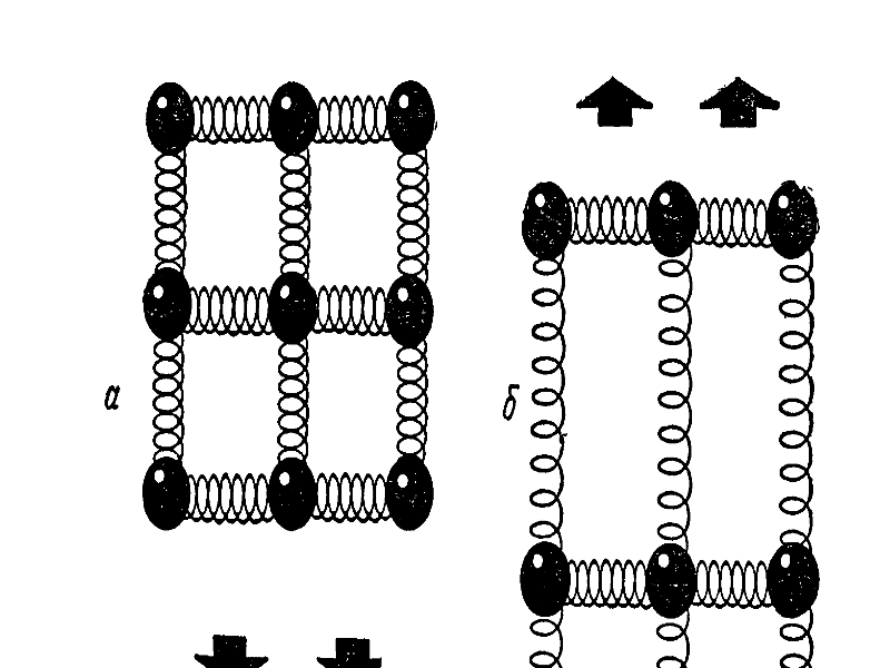 Как же в твердых телах возникают силы, обеспечивающие прочность и упругость (то есть сопротивляемость нагрузкам)? Дело в том, что в любом теле атомы химически связаны между собой. Сами атомы можно смоделировать в виде шариков, а связи между ними в виде пружинок. Вот эти связи и делают тело твёрдым, они же определяют и его химические свойства. Разрушение химических связей освобождает энергию пороха и бензина, те же связи делают резину и железо упругими и прочными. Когда тело полностью свободно от механических нагрузок (такого практически не бывает) пружинки в модели находятся в нейтральном положении. Любая попытка сблизить атомы (сжатие) или оттянуть их друг от друга (растяжение) сопровождается укорочением или удлинением (небольшим) межатомных "пружин". Жесткость этих межатомных связей может изменяться в широких пределах. Смещения во многих телах оказываются очень малыми. Например, если я (массой 100 кг) наступлю на обычный строительный кирпич, то его высота уменьшится примерно на 0,00