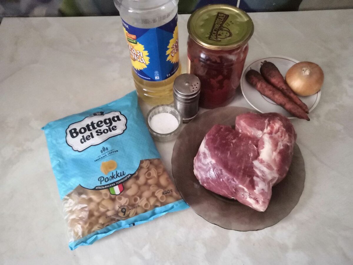 Гуляш с макаронами - полноценный ужин для всей семьи. Для приготовления нам понадобится: Подготовим продукты к жарке. Мясо порежем кусочками для гуляша, лук кусочками, а морковь натрём на крупной тёрке. В кастрюлю с толстым дном наливаем масло и выкладываем лук и обжариваем 2-3 минуты. Далее выкладываем морковь. Далее выкладываем мясо, всё перемешиваем и обжариваем мясо до белого цвета. Далее тушим мясо под крышкой до готовности (примерно час). В это время отвариваем макароны в подсолённой воде следуя указаниям с пачки. Добавляем к мясу соус. Добавляем к мясу один половник кипятка из варящихся макарон. Добавляем соль, перец и лавровый лист. Далее чтобы сделать густой гуляш можно добавить муку. Я добавляю холодной воды до половины кастрюли (нужно будет добавить ещё пару ложек соуса). Откидываем макароны на дуршлаг. Обжариваем макароны на сковороде до готовности. Соединяем макароны с гуляшом при подаче. Если добавили больше воды получаются макароны с мясным бульоном. Приятного аппетита!