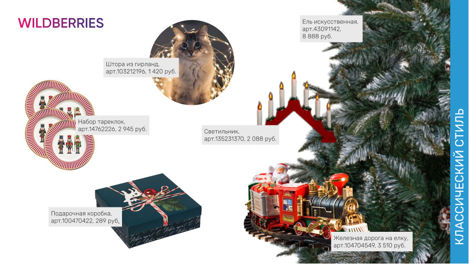 Оформление дома или квартиры к Новому году часто пугает и кажется слишком объемной задачей, но создать атмосферу волшебства конечно же хочется. Первое, что нужно сделать, чтобы избежать предпраздничного стресса и суеты – определиться со стилем. Мы зашли на несколько самых популярных маркетплейсов и готовы поделиться с тобой своими новогодними идеями по оформлению. Классический стиль Новогодняя классика — сочетание красного, зеленого и золотого, носки для подарков на полках, Щелкунчик и теплый свет от гирлянд. Да, праздничное настроение во многом будет зависеть от освещения. Стильные необычные гирлянды позволят в любую минуту создать романтичную обстановку и смягчить суету предпраздничных дней, поэтому советуем остановить свой выбор на однотонных огоньках с теплым свечением. Зайдя, например, на Wildberries, ты сразу окунешься в мир классического новогоднего декора - венки, елки, игрушки, посуда для сервировки, ты сможешь заказать на маркетплейсе все необходимое. Но чтобы помещение выгля
