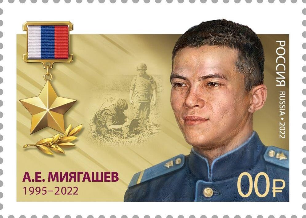 В преддверии Дня Героев Отечества в России выпустили почтовые марки, посвящённые участникам спецоперации, которые посмертно удостоены звания Героя России. Церемония представления марок и их гашения состоится сегодня в Музее Победы на Поклонной горе в ходе форума «Школа героев» в Москве. В рамках серии «Герои Российской Федерации» в почтовое обращение вышло десять марок. На одной из них — портрет нашего земляка, Героя России Аймира Миягашева, который ценой своей жизни спас сослуживцев. Он погиб в конце мая 2022 года в окрестностях одного из сёл Изюмского района Харьковской области, прикрыв своим телом ручную гранату, брошенную противником. На почтовой марке изображены портрет Аймира Миягашева, сцена боевых действий и медаль «Золотая Звезда». Вот фамилии героев, которые изображены на марках: Миягашев Аймир Евгеньевич (1995–2022) — старший радист-разведчик группы специального назначения, гвардии ефрейтор. Герой Российской Федерации (2022).