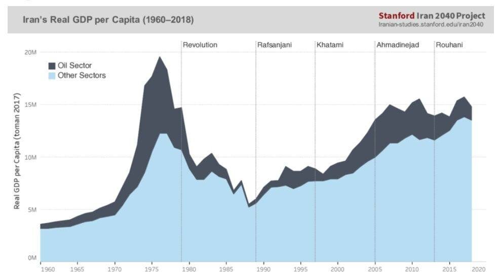 На графике приведён подушевой ВВП страны в реальной величине местной валюты. (Здесь ещё надо отметить, что у Ирана в 1980-е была своя «СВО» - с Ираком, которого натравили на Иран США - почти десятилетие). На восстановление досанкционного уровня (конца 1970-х) без учёта вклада нефти у Ирана ушло 30 лет. С учётом нефти – подушевой ВВП так и не достиг того уровня. С точки зрения экономики – у Ирана полностью потеряны 40 лет жизни страны — исследование Stanford по данным ATEO Breaking. Мой комментарий: Как после этого можно относиться к людям, которые вопят про «нам не страшны санкции, сами разовьемся»? На мой взгляд, как к любым другим людям, которые по незнанию несут угрозу вашим детям.