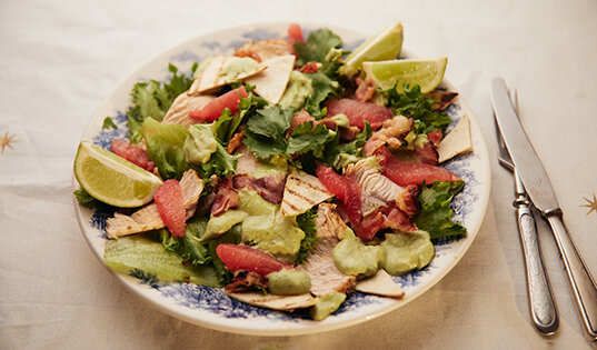 Яркий, сочный, хрустящий салат с индейкой, обжаренным беконом, мякотью грейпфрута и кремовой заправкой из авокадо - оригинальное блюдо для ваших будней и праздников! В отличие от тяжелых классических салатов, этот салат не вызовет тяжесть в животе, и вы сможете спокойно есть его даже в новогоднюю ночь. Вам понадобится: Филе индейки 600 г